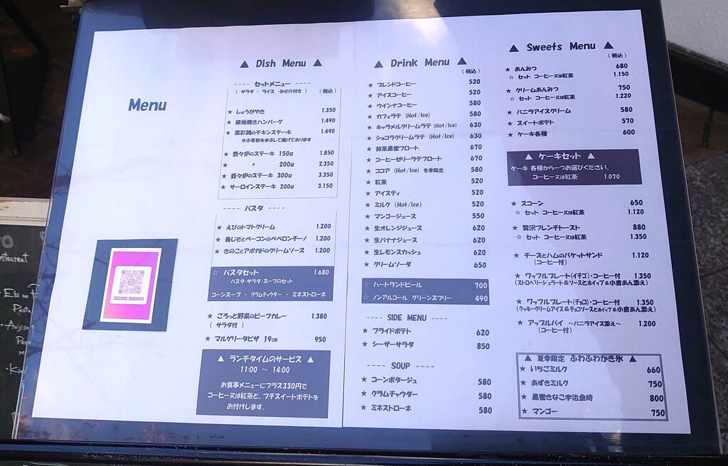 お食事メニューをオーダーしていただいたお客様はプラス¥330でコーヒー又は紅茶をおつけします |