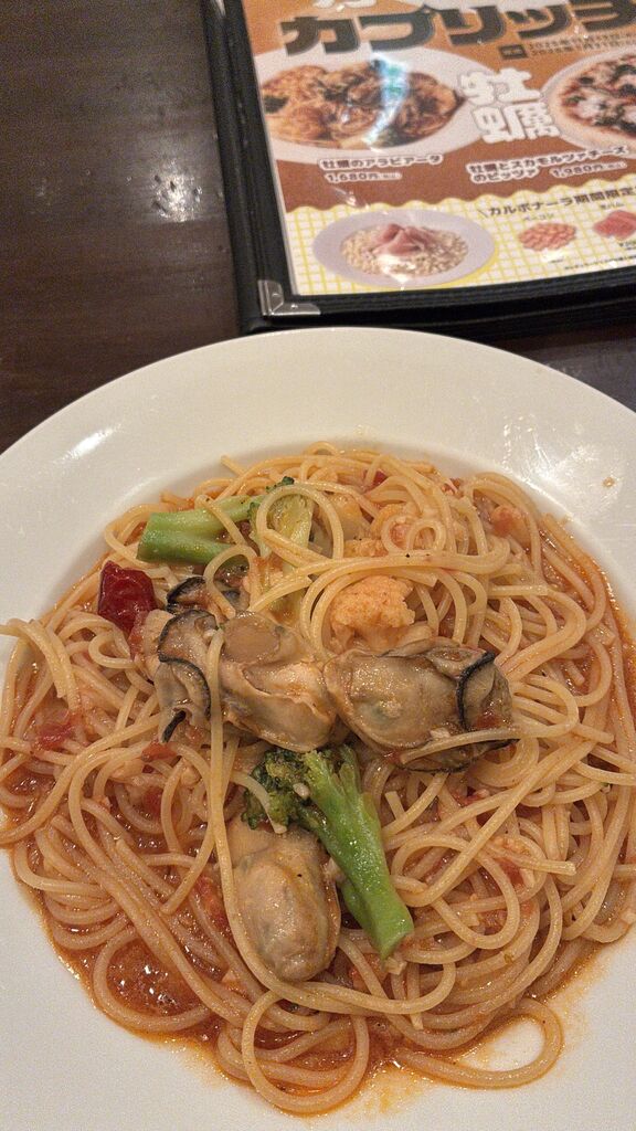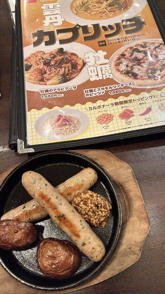カプリチョーザの金券2000円分の使用期限が迫っていたのでランチしに来店。季節限定の牡蠣のアラビアータを注文。レシートクーポンでソーセージを。小ぶりの牡蠣が4つ、カリフラワー、ブロッコリーにんにくが効いて美味しかったです。 (訪問:2025/11/26)