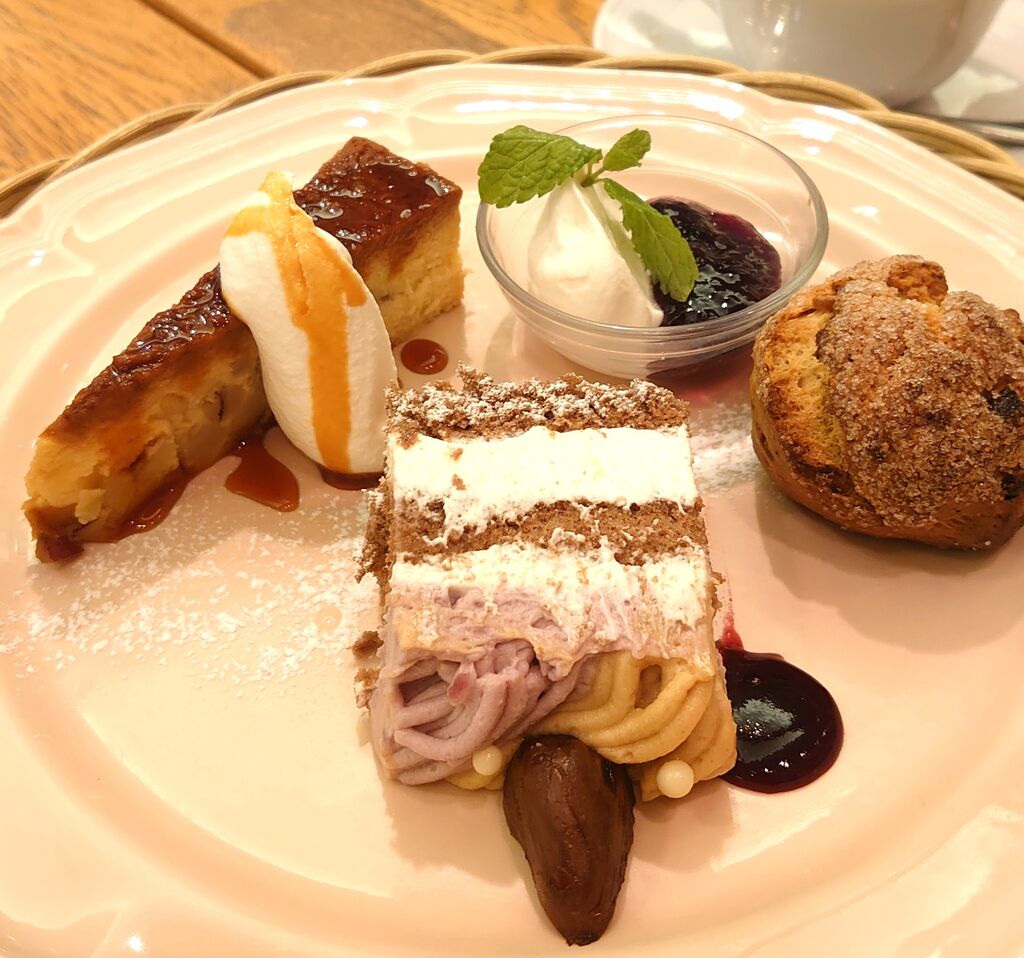 14:00~のアフタヌーンティーセットを頂きました!好きなスイーツを3品選びます!栗とむらさき芋のショートケーキ、スイートポテトプディング、いちじくキャラメルスコーンを選び、飲み物は大好きなアールグレイをオーダーしました!スコーンは香ばしいキャラメルの風味が良いです!なめらかなスイートポテトプディング!しっとり栗の風味良いシフォンケーキ!香り良いアールグレイを頂きながら、美味しいスイーツをゆっくりと頂くなんて、とても贅沢な幸せな一時でした!スコーンと栗とむらさき芋のショートケーキは季節限定です!フード、スイーツ、ドリンクメニューは期間限定の秋のメニューが勢ぞろいです!スペシャルティー、グラスパフェ等も有り、秋を十分に満喫出来ます!素敵なお茶の時間をありがとうございました!また楽しみにお伺いしたいと思います! (訪問:2025/10/16)