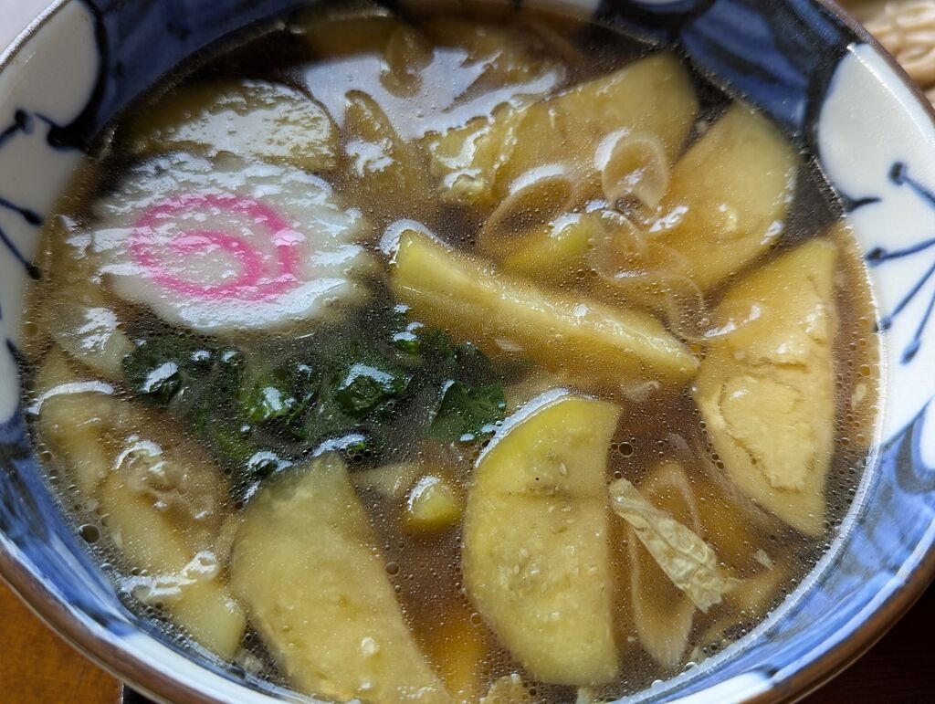 お店の入口には野草や高山植物などが多く販売されていました。店内に入り奥のテーブルに座ると窓の外には滝が見えたりします。【乳茸そば】【乳茸すいとん】と迷いながらも、蕎麦で注文。南会津産のそば粉を使用していて、香り豊かで、少し黒いお蕎麦でした。温かい乳茸汁はしっかりと乳茸の味がしていてコクがあり、ナスとの相性がやっぱり抜群ですね。炒めたナスもトロトロで美味しかったです。 (訪問:2025/09/10)