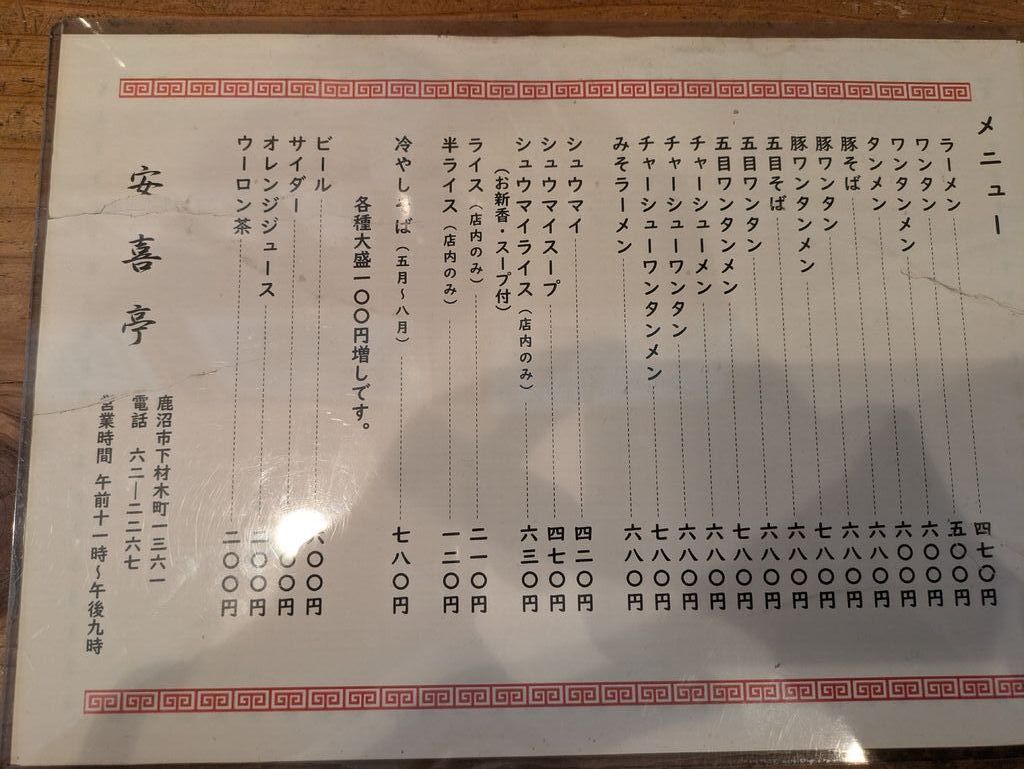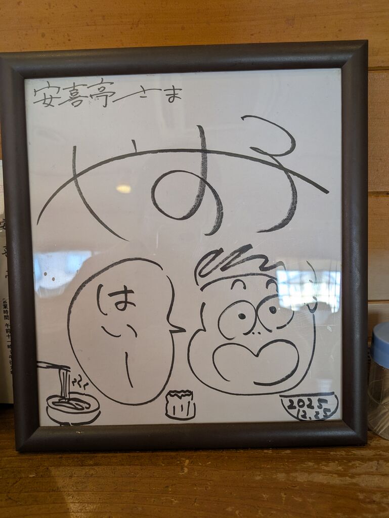午後1時間頃に伺いました。今日は奮発して五目ワンタンメンとシウマイを。具材はワンタン、ゆで卵スライス、チャーシュー、ナルト、キャベツと玉ねぎです。とろみは無く野菜の甘みを感じるスープです。そしてシウマイは醤油ではなくソースで食べて欲しい。このシウマイにはソースなんだな~!先日テレビで安喜亭さんが鹿沼人が選ぶ好きなラーメンナンバー1になりましたが納得です。流石100年以上続く老舗ですね!やすこちゃんがロケに来たのでサインが有りました。下にシウマイの絵が…ぷぷぷ (訪問:2026/02/17)