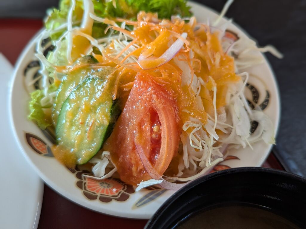 近くの床屋に散髪に来たのですが90分待ちでしたので、ランチを先に済ませてしまおうと思いお邪魔しました。週替わりの肉、魚のランチや創作丼などもありましたが、今日はハンバーグが食べたい気分でしたので【ハンバーグランチ】1500円を注文。まん丸ハンバーグはお箸を入れると肉汁が溢れ出してくるジューシーハンバーグでした。サラダもボリュームがありドレッシングも美味しかったです。テーブルの間に仕切りがあり、人の目を気にすることなくランチをいただけました。ごちそうさまでした。 (訪問:2025/11/17)