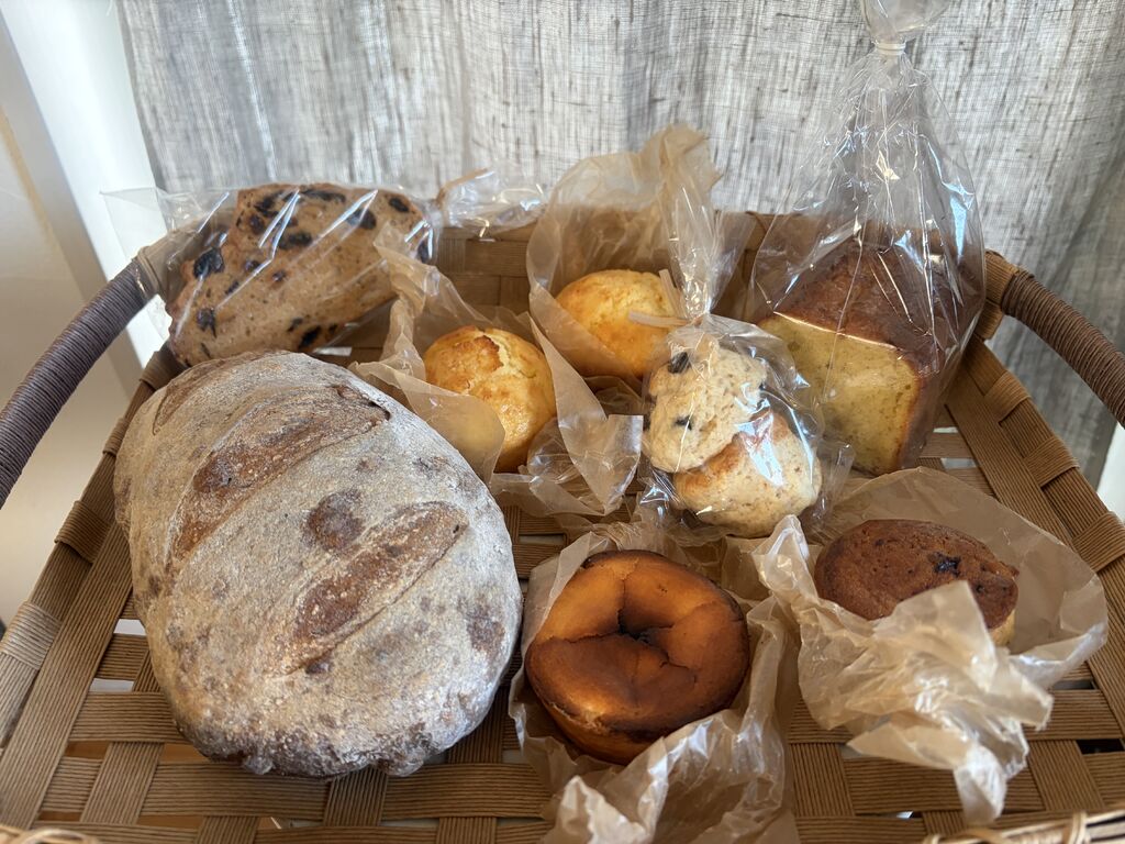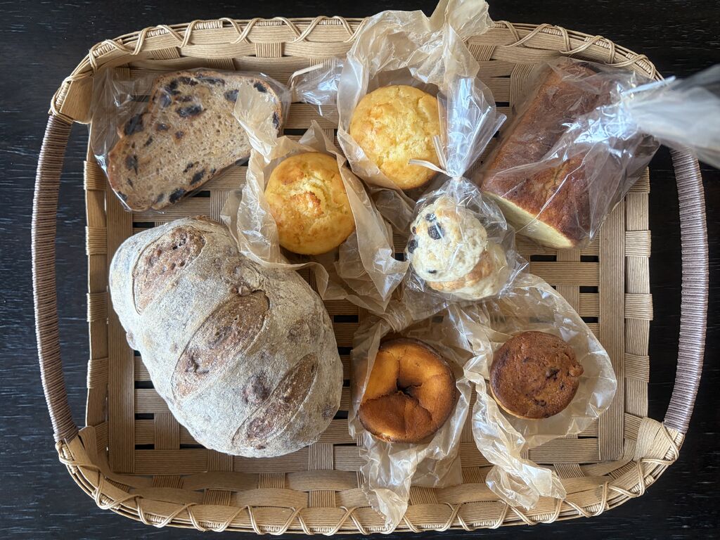 11:50、、、焼き上がり『ライブレッドひとつ用意できますよー!薪の香りゆたかなナオゾーにふらっと寄ってきました。「ハード系パン、何かありませんか?予約はしてないのですが、、、」。左上のレーズンラスクから時計回りに、バナナマフィン2個、バナナケーキ、スコーン2種、レーズンマフィンとチーズタルト、そしてレーズン酵母のほどよい酸味のライブレッド。1cmほどに薄めにスライス、クリームチーズやバターでリッチに、トマトなどの瑞々しいお野菜をのせて、もちろんオリーブオイルも美味しいですよ、、、と。おすすめないただき方を教えてくださいました。お忙しい中でもそんな会話をしてくださる温かな空間にも、とっても癒されますね。 (訪問:2026/04/11)