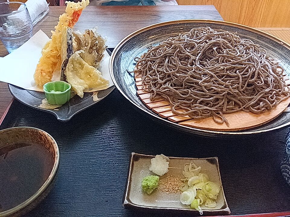天ぷら付き十割蕎麦(黒)を注文しました。天ぷらは薄衣でサックサク食感でタネも豊富です。(海老、舞茸、キス、ピーマン、ナス、レンコン)お蕎麦は十割なのに、びっくりする程の細さでした。昼過ぎでしたが、次から次にお客さんが来店されます。ミニ丼等のメニューも取り揃えられていましたので、次回は丼ものを楽しみたいです。 (訪問:2025/09/14)