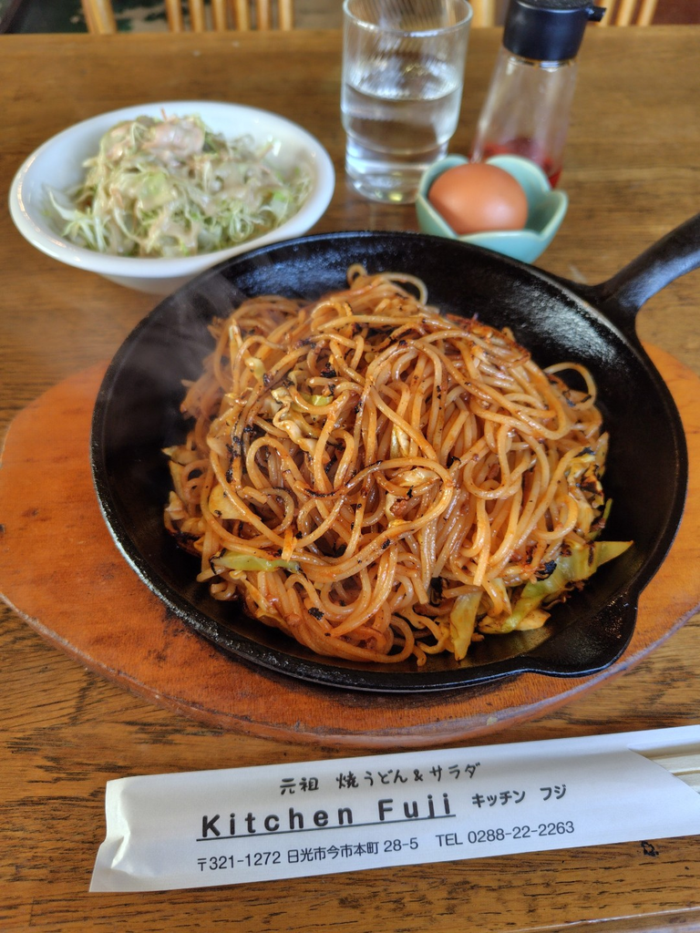 平日のおひとり様ランチで、kitchen fuji さんにうかがいました!すっごく、すっごく良かったです(*^^*)♪ お店は、看板が見つからないほど控えな外観ですが、店内に入ってみると広く、昭和レトロな感じが落ち着きます(テーブル席のほかカウンター席もあったので、おひとり様でも利用しやすいですよ)。ランチメニューの 焼きうどん・サラダ・ドリンク のセットをいただきましたが、まず、こんもり盛られたサラダのドレッシングが感動的に美味しい!そして、メインの 焼きうどんが、これまた どえらく美味しいです☆ もっちりした うどんが良く焼けていて、熱々の鉄板に醤油を垂らせば さらに香ばしく、添えられたバター・半熟卵と合わせて食べればマイルドに。好みで七味をかけるのもいいですね。ドリンクはオレンジジュースをお願いしましたが、珈琲・紅茶など、数種類から選べます。これでなんと800円…。この時代にお得すぎ♪お店の方も感じが良く 良いお昼時間を過ごせました。ごちそうさまでした。 (訪問:2024/01/11)