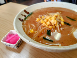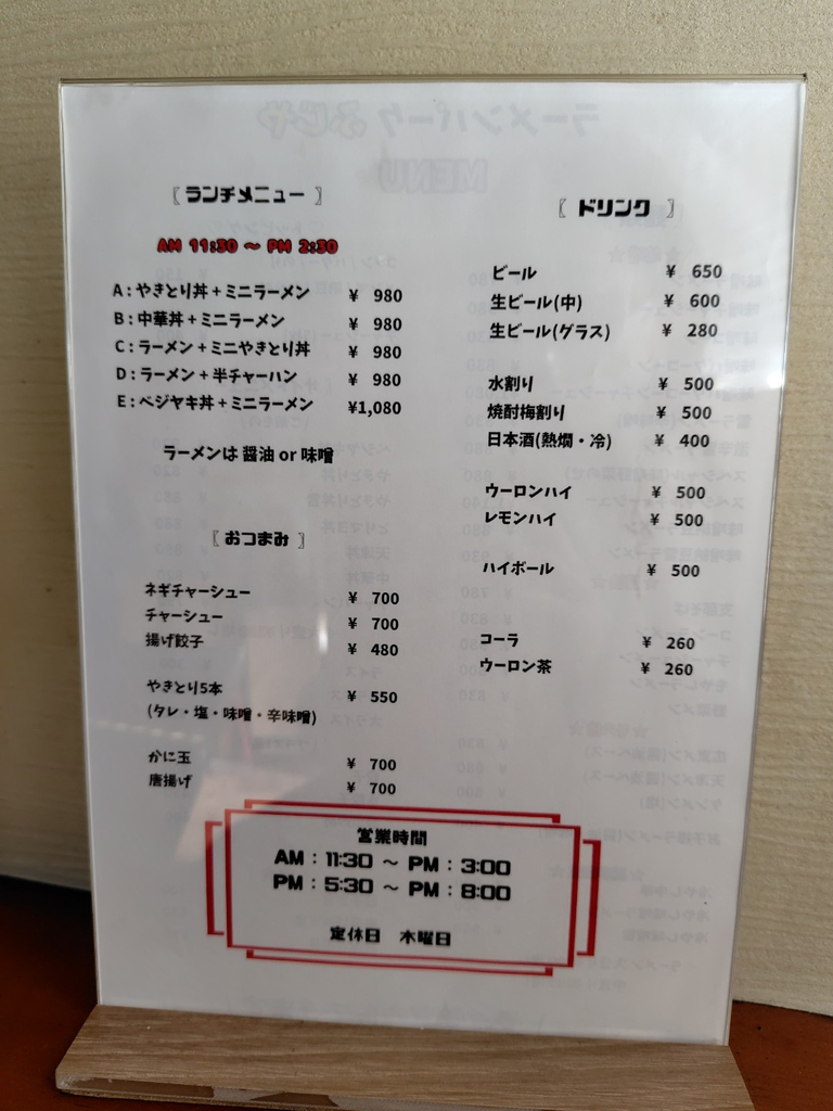 チャレンジメニューがあります。超大盛りラーメン20分以内で食べればお代は無料です。私がお店にいる間では挑戦者は見当たりませんでしたがお店の壁に成功者の写真が数多く貼られていて女性もおられました。ランチメニューCラーメン+ミニ焼き鳥丼780円税込みを注文しました。ラーメンは醤油か味噌か選べますが全国のラーメンを研究して作り続けて50年のお店推奨の味噌ラーメンにしました。ラーメンの具材はニラ、コーン、モヤシ、挽肉です。麺はシッカリとした細麺です。風味とマロヤカさが感じられるスープは粒などなく良くこされていて飲みやすかったです。焼き鳥は香ばしく弾力があってゴハンが進みました。 (訪問:2023/06/17)