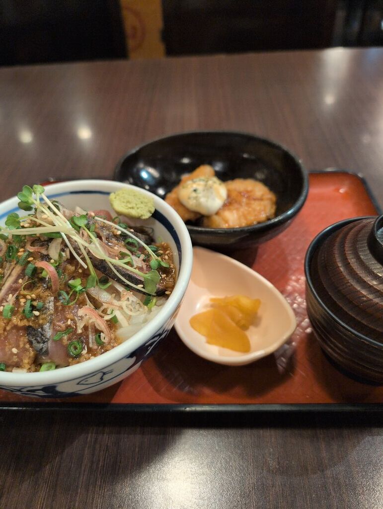 NEWインパに来るとラーメンを食べることが多いけど今日のランチはお米が食べたい、店外のポスターに惹かれてこちらへ。待つことなく席に案内されました。温かいお茶が嬉しい。注文はカツオ塩麹漬け丼とチキン南蛮のセットで1298円。たっぷりご飯の上にタマネギ、漬けカツオ、ミョウガ、ネギがのってます。カツオでご飯を一口、酢飯ではなかったのでチキン南蛮でまた一口と食べ進めちょうどよく美味しく頂きました。インターパーク店限定10食の豊洲直送品の丼も気になりました。カキフライも旬だそうです。 (訪問:2025/12/04)