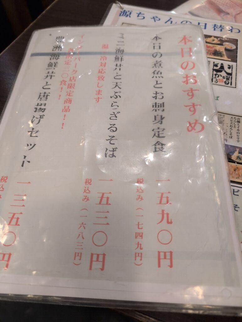 夕飯を頂きに行きました!本日の煮魚と刺身定食、ミックスフライ定食、サーモンとネギトロ丼にアジフライをセットしました!ネタが大きくて柔らかく、食べ応え十分です!煮魚はふんわりと解ける柔らかさで、大根もしみしみで最高☆とにかく美味しそうなメニューが多くて、品定めが一苦労な嬉しいお店です☆ (訪問:2025/11/16)