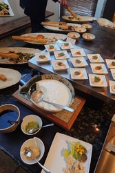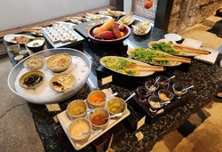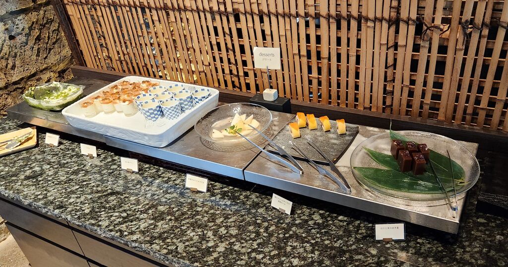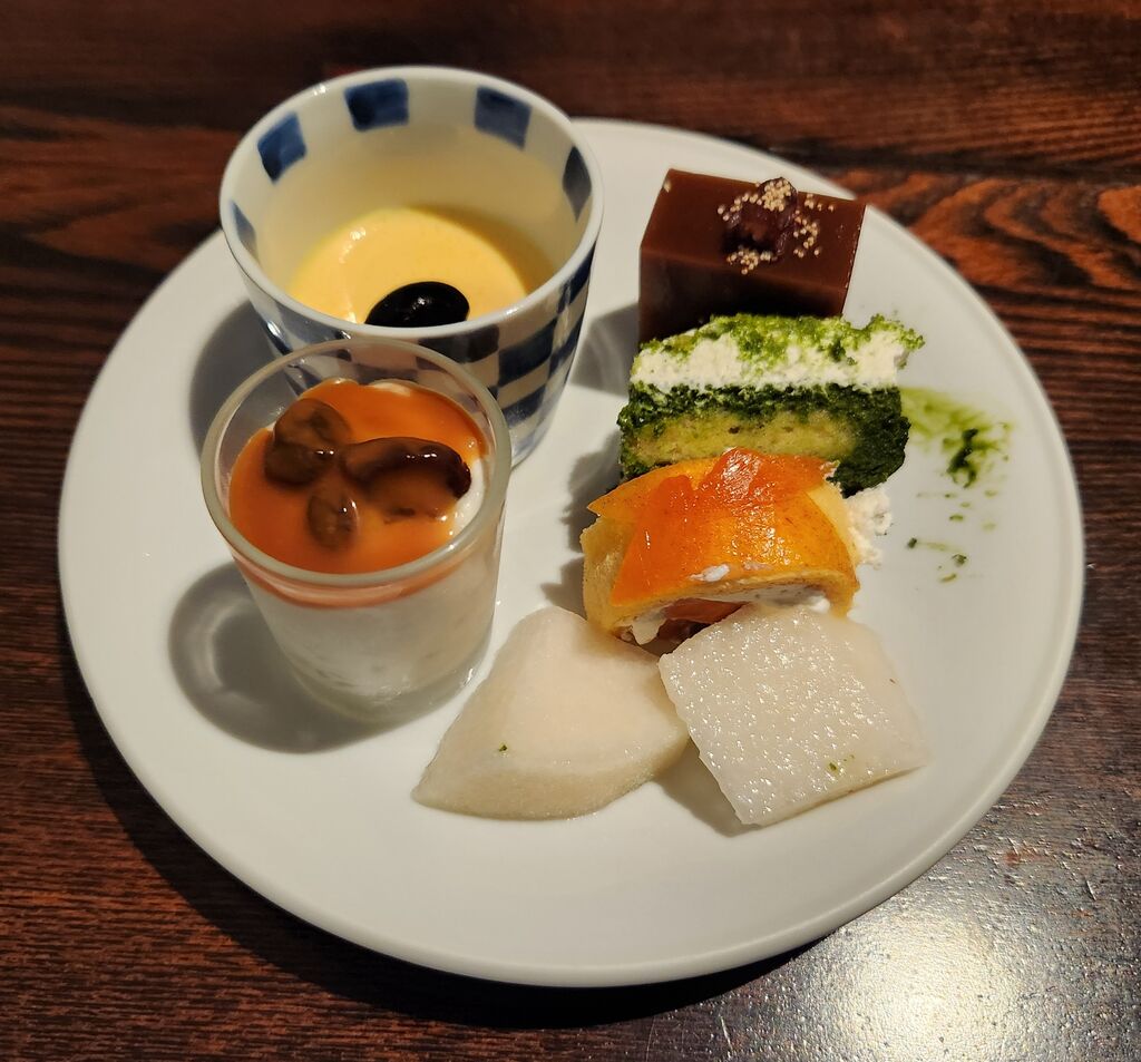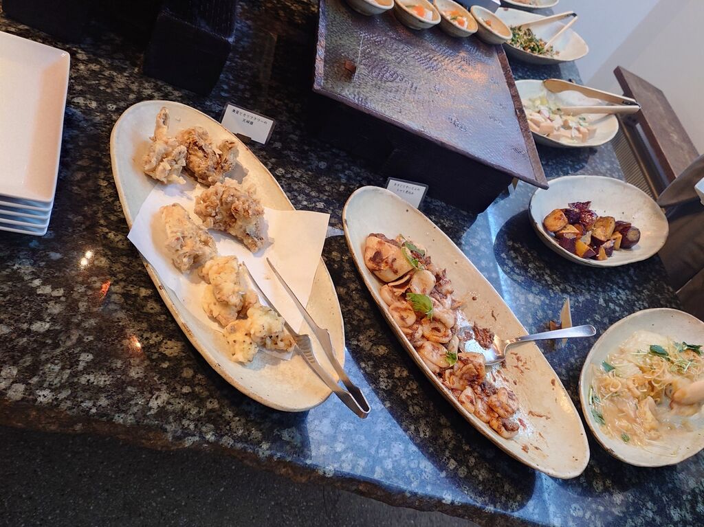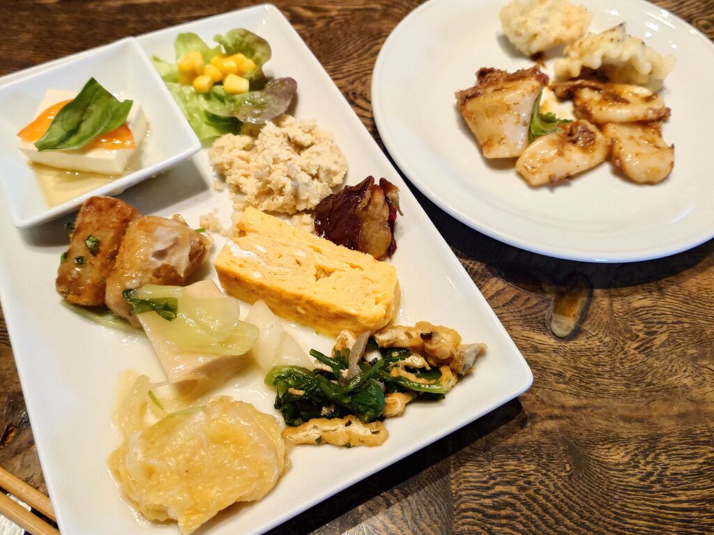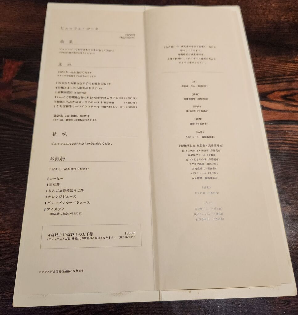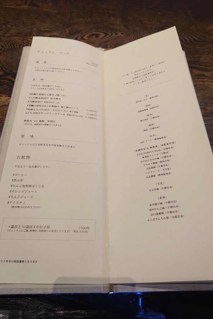 久しぶりにこちらのビュッフェが食べたくなり訪問しました。人気ありますね1週間後の12:30ならと予約できました。注文は「ランチビュッフェコース 3,080円×2」私は・和豚もちぶた肩ロースのロースト 柚子胡椒 … +300円・オレンジジュース。妻は・牡蠣とよしむら椎茸のドリア・黒豆茶。品数豊富なビュッフェでお腹一杯。満足のランチでした。【ビュッフェコース】■前菜・甘味 ビュッフェから。■主皿・秋刀魚と万願寺唐辛子の石焼きごはん・牡蠣とよしむら椎茸のドリア・真鯛茶漬け 茶漬け出汁・いっこく野州鶏と栃の木まいたけの オムライス +200円・和豚もちぶた肩ロースのロースト 柚子胡椒 +300円・とちぎ和牛サーロインのグリル 和製チポトレソース +2000円。■お飲み物・コーヒー・黒豆茶・りんご加賀棒ほうじ茶・オレンジジュース・グレープフルーツジュース・アイスティ。 (訪問:2025/11/02)