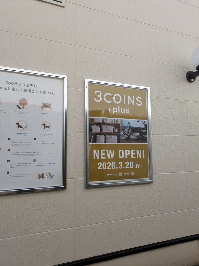 妻とぶらっと買い物に来ました♪♪大寒波で雪がちらつく極寒の中、震えながらショッピングしました。そして歩いていると、空き店舗に3COINS+オープンのお知らせが貼られていました。オープンしたらまた来ようと思います♪ (訪問:2026/01/20)