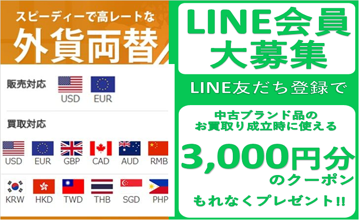 LINEお友達キャンペーン 新たにラインでもお問合せいただけるようになりました。外貨レートや販売・買取価格など、お問合せにご利用いただけます。今なら中古ブランド品お買取り時に使えるクーポンも配布中!!ぜひこの機会にご登録ください