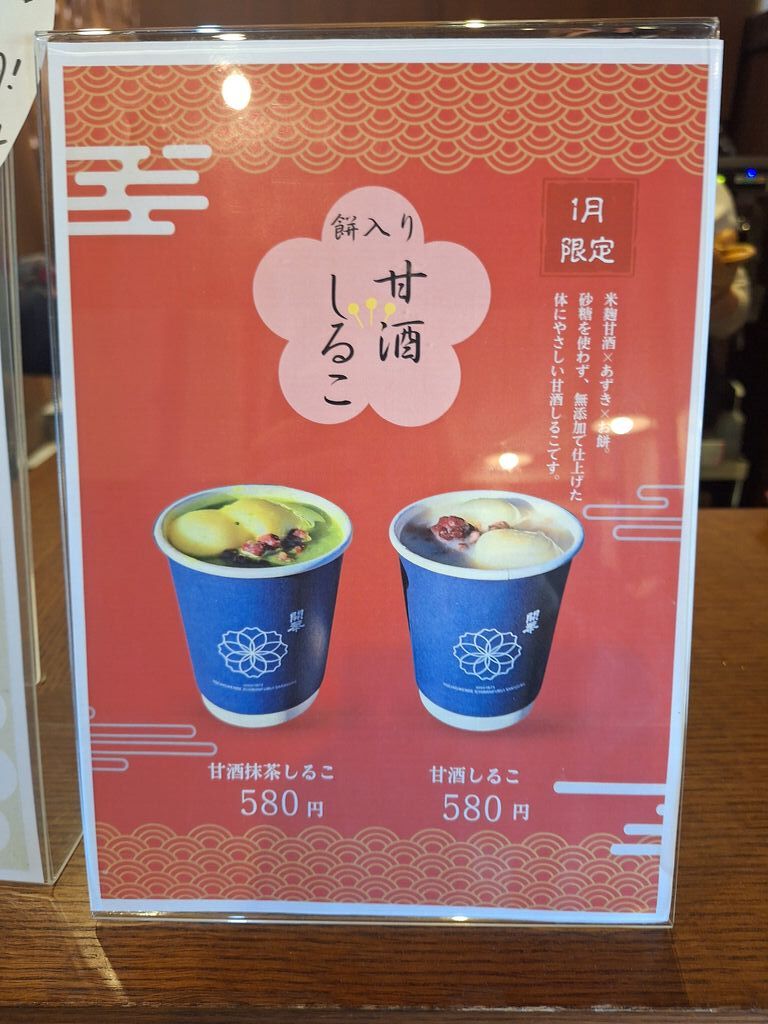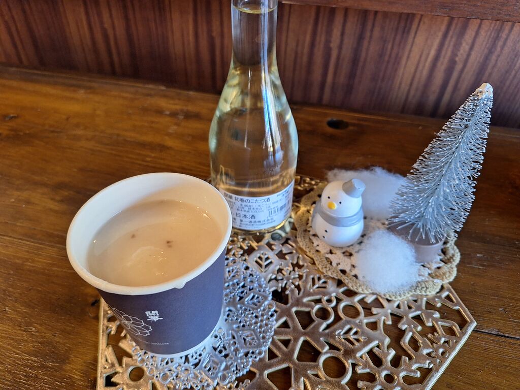 今月も『月替わりのお酒300ml830円』を求めて14時半頃お邪魔しました。店内は量り売りを求めるお客さんや、既存のお酒や新種を求めるお客さんで賑わっていましたが、店員さんの手際の良さで待つこと無くお会計。第2・4の土日にオープンしてるカフェにも行き、『甘酒しるこ580円』をオーダー。こちらにもたくさんの方が居られ、店員さんがお忙しそうに注文をさばいていました。一品一品丁寧にお作りになられるので多少待ちますが、出来上がりにワクワク。甘酒と小豆、そしてお餅が入った温か~いおしるこ。風も強かったのでその場で頂きましたが、甘酒の優しいお味に小豆がマッチ☆お餅も柔らかく食べ応えもバッチリ!甘酒はフルーツ酢と割ったりしながら頂きますが、原料がお米なだけになんでも仲良しな組合せが出来て楽しみが広がります。今月のお酒は香りがとってもフルーティー‼あれ、今フルーツの香りを嗅いでいるの?って思うほど。飲み口もスッキリしていて飲みやすく、スススっと飲み進めてしまいそうです♪弱いのでゆっくりじっくり楽しみたいですが^^年始早々美味しい出会いに幸先良さそうです。 (訪問:2026/01/11)