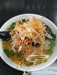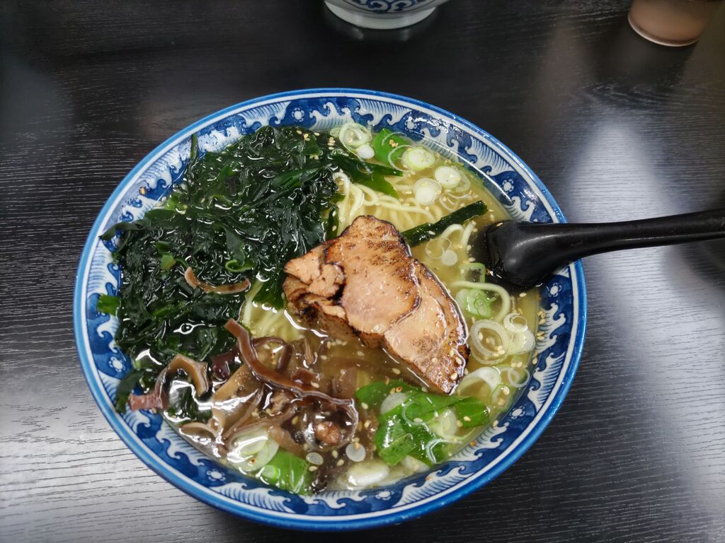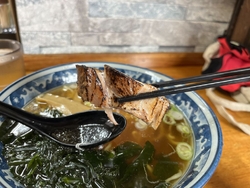塩そばをいただきました。注文が入るとチャーシューを炙り初めてその香りが食欲をそそります。たっぷりのわかめと存在感のある厚切りチャーシュー、太めの麺で1口目にふわっと香るシソの香りが…。スープが美味しくて完飲です。 (訪問:2025/10/18)