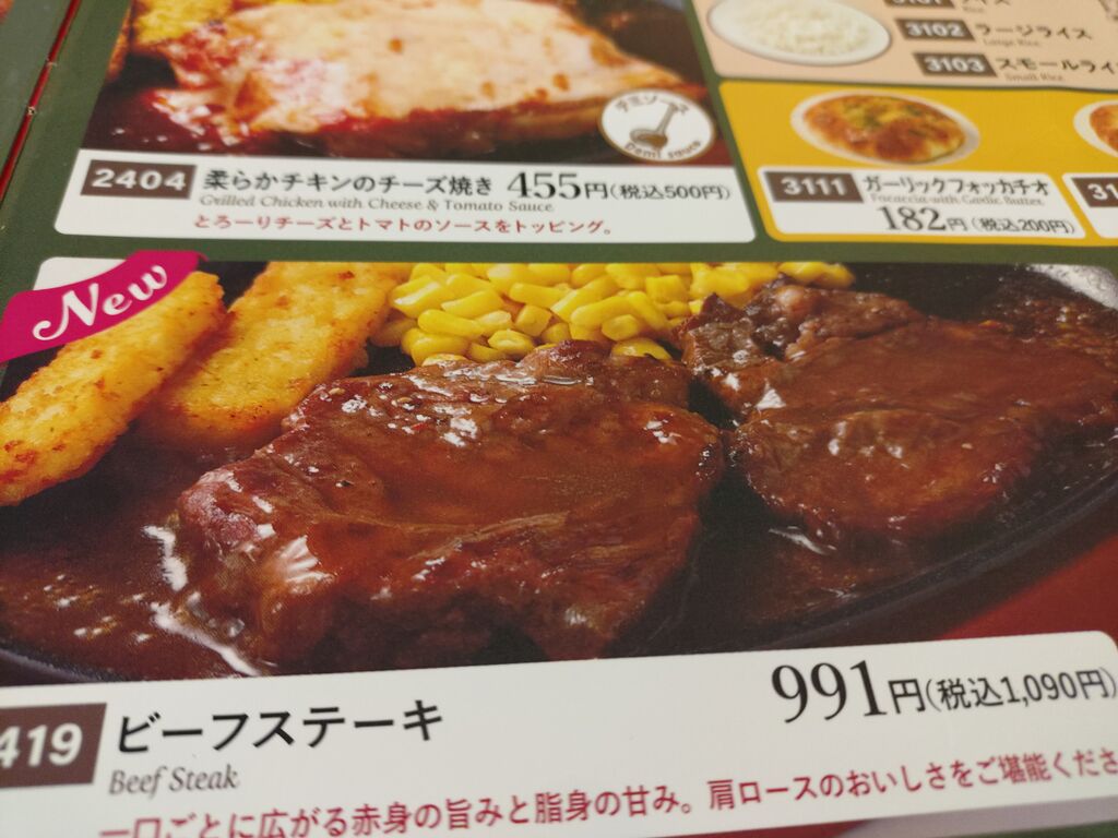またまた、サイゼリヤで、美味しいメニューをいただきました。今回は、いただいた美味しいメニューについて、お話をしたいと思います。いただいた美味しいメニューは、写真に掲載しました通り、ビーフステーキ、チョリソー、ライスになります。お肉とご飯が主のメニューです。ビーフステーキは、柔らかく、美味しいロース肉で、お店特製タレでいただきます。チョリソーは、ピリ辛ソーセージです。いずれも、ご飯との相性は、バッチリです。最後まで、美味しくいただきました。お肉料理が好きな方は、是非、食べてみてください。今回も読んでいただき、誠にありがとうございました。 (訪問:2025/11/28)