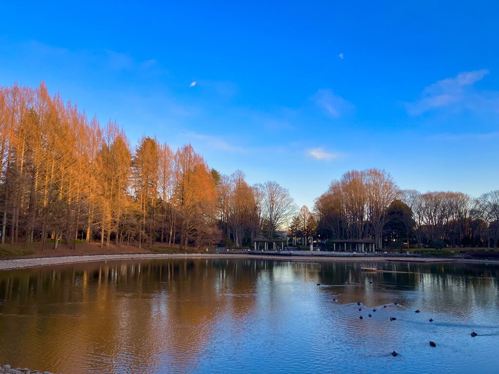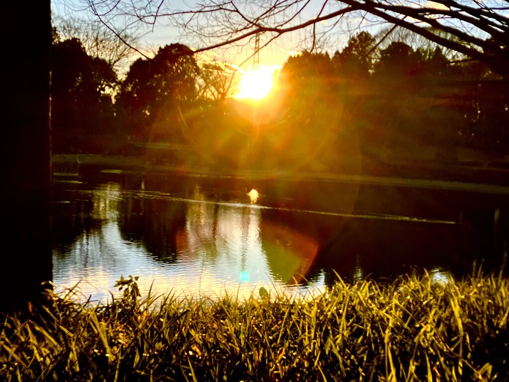 こんなに寒い時期に来たのは初めてかも知れません。気温を見たら3℃でした。どおりで寒いはず・・・。凍てつくような空気の中、約30分程ウォーキングしました。刻々と変わる夕刻の情景は、美しい(ღˇ◡︎ˇღ)水面や夕日に照らされた葉っぱがキラキラと黄金に輝く✨最後に広場の中にある一番大きな大木に元気をもらい公園を後にしました^_^ (訪問:2026/01/21)