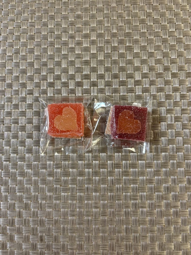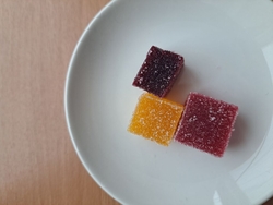 パート・ド・フリュイという、フランスでは有名な旬の果実の風味をそのまま閉じ込めた・ひとくちサイズのゼリーです。常時20種類以上あるフレーバーは季節によって変わります。香料や着色料にたよらない自然の色と果汁の味をお楽しみください。