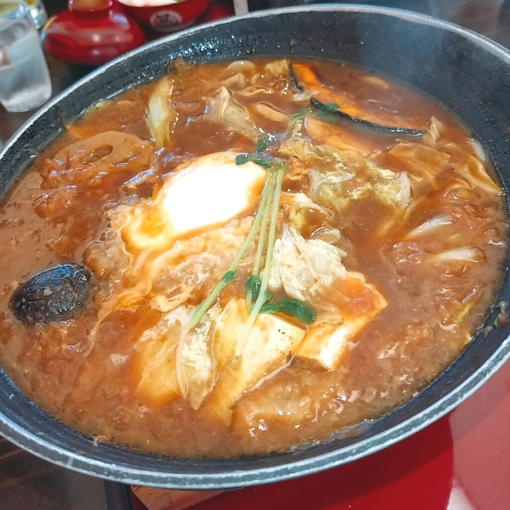 2回目の訪問です。今回はずっと食べたかった味噌煮込みうどんいただきました。麺の量が選べるので、少なめをチョイス。ランチだと漬け物とご飯が付きますが、気が付かず単品で注文してしまいました。なんと前掛けまで付いてました。しかも紙じゃなくて立派な生地で出来た前掛けで、お店の心遣いを感じます。うどんの汁がはねるのを気にせず食事が出来ます。太くてモチモチしたうどんと、赤味噌のコクがクセになる美味しさでした。人気ナンバーワンなのも納得です。また冬に食べたいです。 (訪問:2025/10/24)