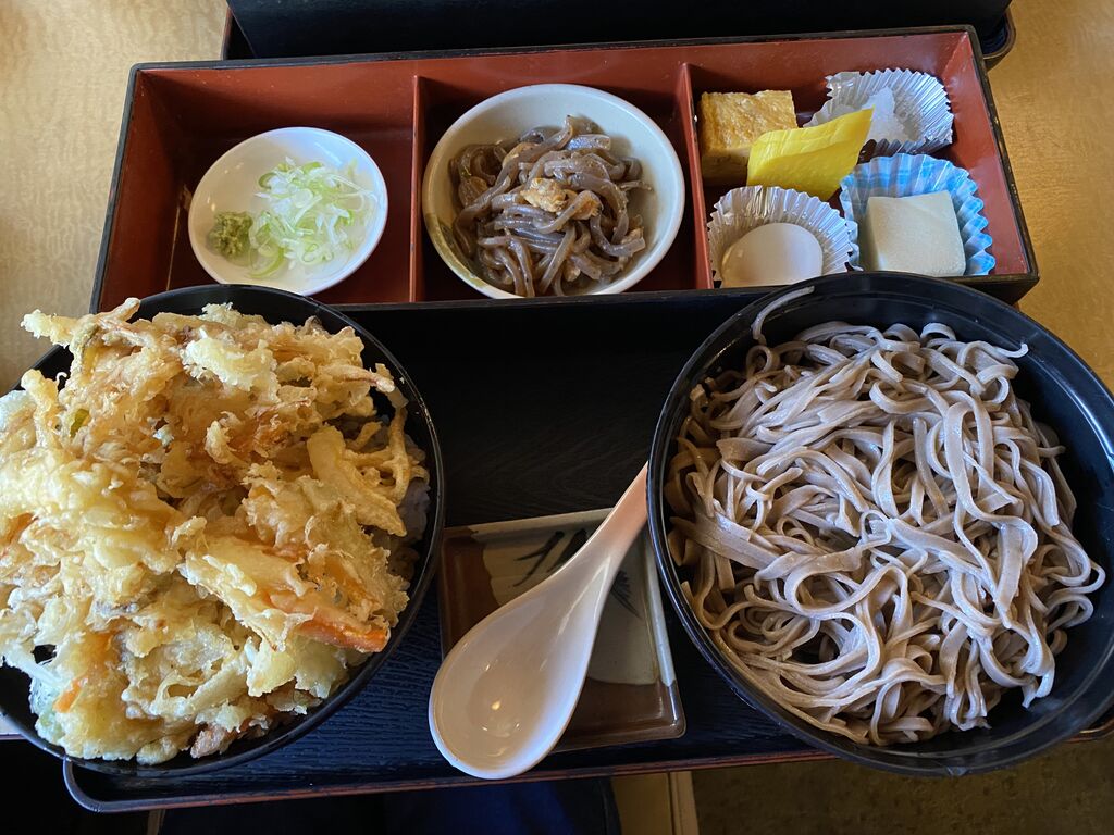 NEW2人でランチ訪問しました。2人共かき揚げ天丼セット980円を。蕎麦、天丼、温かい付け汁、タマゴ焼き、こんにゃくとシジミの煮物、高野豆腐、沢庵、みたらし団子がセットになっています。ボリューム満点、コスパ最高の極旨ランチでしたが、食べきれずパックを頂いて夕飯に。居心地が良くアットホームなお店で、女将さんも接客が凄く優しいです。美味しくてまた行きたくなるお店です。 (訪問:2025/12/05)