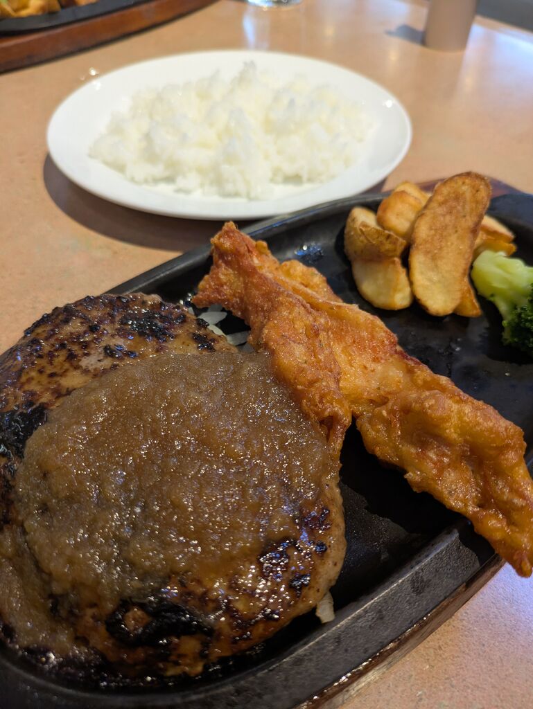 家族でディナーに行ってきました。注文はどでかエビフライコンビにしました。どでかの名前通り大きなエビフライに目を引かれます。サクサクでしっかりと身のつまったエビフライをタルタルソースにたっぷりつけて食べると、もう幸せです。ハンバーグも目の前で切ってくれるのでパフォーマンス的にもGOODですね。肉肉しくジューシーでご飯がよく進みます。ライスおかわり無料サービスも嬉しいです。こちらのお店は店員さん達の接客がとても丁寧で居心地がいいですね。 (訪問:2025/12/14)