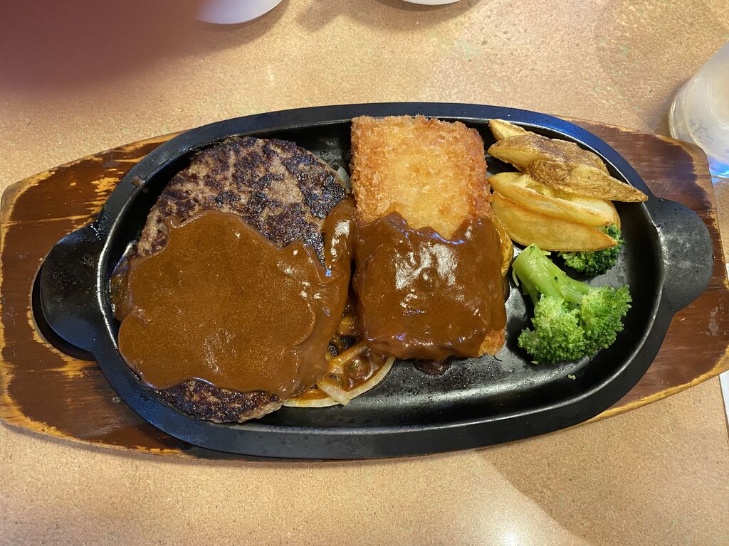 コンビランチのランチ超人(¥1,188)を注文。ハンバーグ+コルドンブルーの組み合わせで、デミグラソースで頂きました。コルドンブルーは、鶏肉にチーズとハムを挟んで揚げたフランスの定番料理らしく、美味しかったです。ドリンクバーやスープ、ライスと共に楽しめたランチでした。 (訪問:2025/11/21)