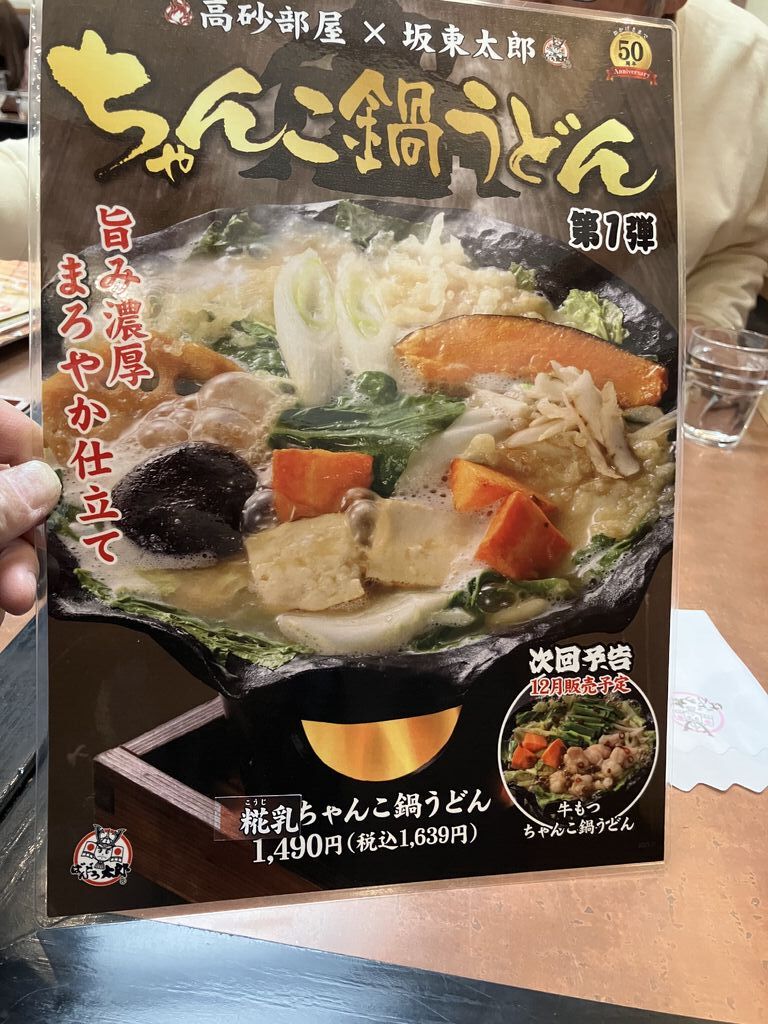 近くを通ったら花輪が上がっててリニューアルオープンしたようで寒くなってきたので鍋焼きうどんでもと思い寄ってみました。入ったら中は変わってはなかったですが混み合ってました。今回はちゃんこ鍋うどんという期間限定のものをオーダーしました。高砂部屋とのコラボらしくとても美味しく頂きました。この後に続く限定メニューも、気になるところです。また近いうちに来たいなと思いました。ご馳走様でした。 (訪問:2025/11/16)