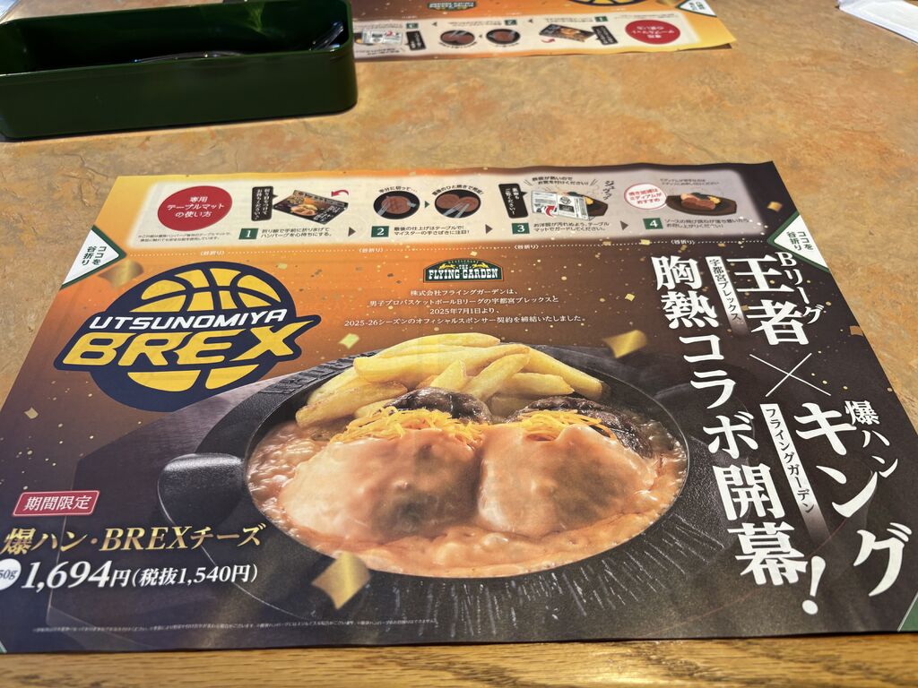 フライングガーデン若松原店。宇都宮ブレックス×フライングガーデン コラボメニュー、爆ハン BREXチーズ今までにないチーズソースたっぷりで美味しさ爆発です! (訪問:2025/08/31)