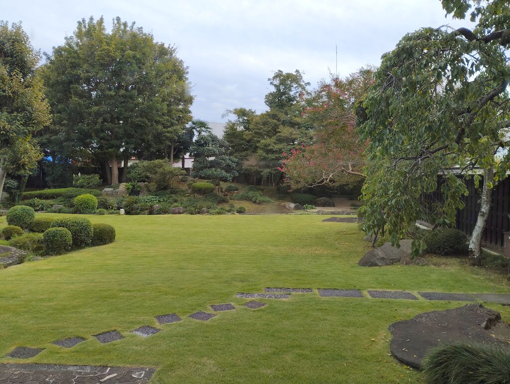 ◇回遊式の日本庭園1,600㎡を備え、周囲を地元産の磯山石(現在は生産終了)を使用した石塀をめぐらしています。銀杏の大木と松、梅、紅葉などが植栽され、小鳥のさえずりが聞こえる静かな所です。 |