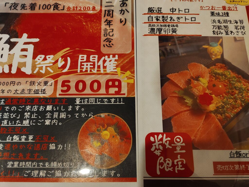 さくら市さんのランチを調べて、こちらのお店を発見。早速伺いました。時間前に伺うと、どうやら、並んで待つスタイルです。待つ椅子に番号がふってありました。先着5名様が鉄火どんをほぼ半額で食べられるとのことです。今回ラッキーにも先着5名に入れました。金の魚のぬいぐるみがその目印です。見た目も華やかですし、ボリュームもあって美味しかったです。またお店の方の感じも良かったです。ほかにも気になるメニューがありましたので、また伺いたいと思います。 (訪問:2026/02/11)