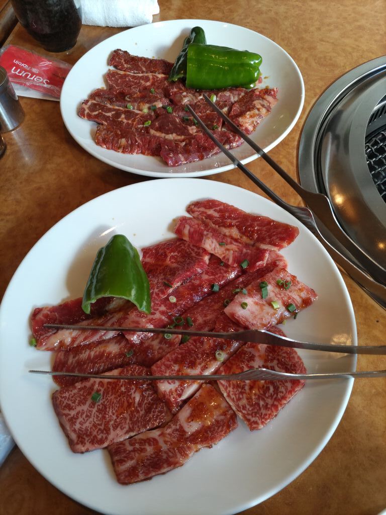 久々の訪問です。朝日岳登山でお腹が空いたので、ガツンと焼肉です。炭火焼肉をお手頃価格で食べるなら、ここですね。スマホからの注文で提供が早いのも嬉しいです。厚切りタン、ハラミ、カルビ、ネギチヂミ、ビールとハイボール。旨い旨い!ビビンバで締めました^_^ (訪問:2024/05/26)