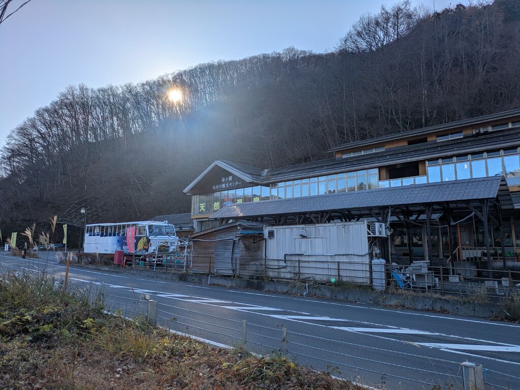 栃木の方から行くとトンネルを抜けてすぐ曲がると、湖のほとりにある道の駅です。外には足湯もあります。「水陸両用バス」で行くダム湖探検ツアーの発着所になっています。本格的な温泉や売店が併設。売店では栃ナビさんのチケットを使わせていただきました。火曜日が定休日です。 (訪問:2025/11/29)