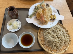 | 天せいろ (冷たいそばに、活巻海老と季節の野菜の天ぷら付きです。) |