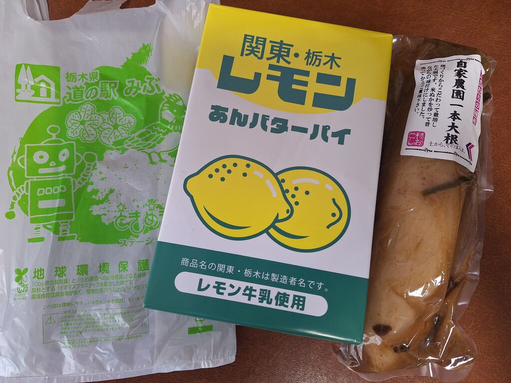 レトロなパッケージの可愛いお土産をいただきました☆レモン牛乳があんバターパイになったのですね。しっとりしたパイの中にレモン牛乳風味の白餡とバターが入っています。甘くて美味しかったです。自家農園で化学肥料を一切使用せずに育てた土からそのまんまの大根を使って作った一本漬けは、昔ながらの安定した味でした(^ー^) (訪問:2025/10/26)