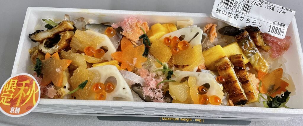ある頻度で京樽のちらし弁当が食べたくなります。見た目が綺麗で軽い昼ご飯に最適。今日は期間限定の秋の吹寄せちらし。秋鮭、数の子、穴子、もみじ型の人参。紅葉の色合い。楽しい昼ご飯となりました。定常メニューのバラちらしも美味しいですよ^_^ (訪問:2025/09/16)
