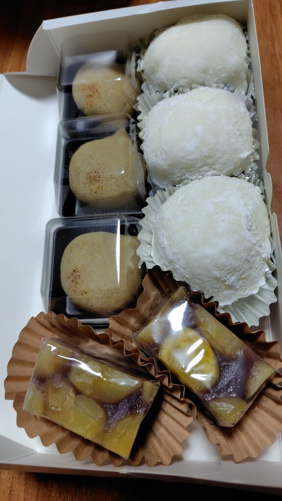 美味しくて大好きな『羽二重チーズ260円』。友人宅へ伺う手土産にと前日予約をして当日伺いました。まだまだシーズン開始だからか、前日でもすんなり予約出来、ひと安心でしたけど、お店に伺うとおそらく当日分をお買い求めだろう方が車でスタンバイしてる姿も。やはり予約は必須の人気商品。併せて『焼栗230円』『きんかん大福210円』『栗むし羊かん300円』をゲット。ふわっふわの羽二重、友人宅で出すとふわふわで溶けてなくなっちゃう、と大好評。やはり鉄板の美味しいものですね☆大好きな焼栗、滑らかななかにもほんのり食感が残る仕上がり。栗と砂糖だけで出来ているので栗の旨味がたっぷりで大好きなお品♪夏季限定のきんかん大福が残っていたのは嬉しい限り。もちろんゲット。きんかんの爽やかな香り、蜜のような甘味とほんのり苦味が楽しめる大福。ただただ甘いだけではない複雑なお味に大満足^^栗が好きな両親にはたっぷり栗が入った栗むし羊かんを。こちらもとても喜んでもらえました。やっぱりいい村さんは何を頂いても美味しいし、他の人にも喜んでもらえて嬉しいです‼ (訪問:2025/10/13)