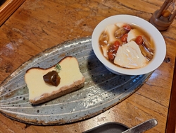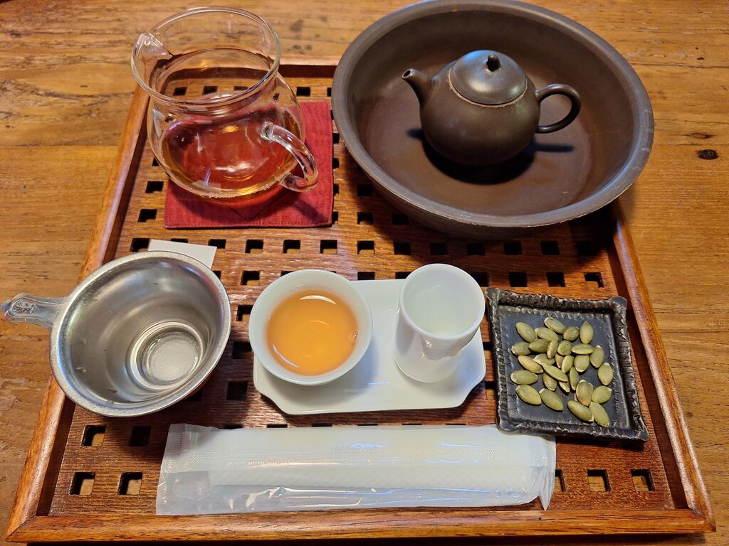 癒しには中国茶と言えるほど、疲れたときにぴったりなお飲み物。今回は販売用の茶葉に記載してある、お茶愛溢れる店主さんの一言で、ものすごーく気になってしまった『杉林渓鉄観音1100円』に『チーズケーキとのハーフセット520円』を添えてオーダー。鉄観音といえば某有名飲料メーカーの烏龍茶で、スゴく好きなジャンルではないなぁと敬遠していましたが、お茶愛溢れる店主さんが美味しいと太鼓判を押すなら絶対旨いはず!とチャレンジ。香ばしい焙煎の香り、うぅ、もしかしたらダメかも…と、一瞬躊躇しつつ頂いてみると、お味は軽やかで、杉林渓特有の爽やかさがあり、後からほんのり甘味で美味しい☆一瞬でも店主さんを疑った自分が恥ずかしい。。。2煎目はこちらで仲良くなったお友達との話しに花が咲き抽出しすぎて濃くなりましたが、それでも美味しいと思えるお味。力強さは半端ありませんでしたが。が、煎を重ねる毎にまろやかさもあり、香りも朗らかに美味しく何煎も楽しめる素敵なお茶でした‼大好きな豆花と、コクもあるけど爽やかさが癖になるさっぱりチーズケーキで毎度悩み、そんな私に嬉しいハーフ&ハーフ!小振りなので、悩んだ時は絶対おすすめのおやつです♪お友達とお茶を飲み、たくさん話して、美味しくて…。幸せな時間で心が癒されました^^居心地の良い空間とお茶、それらを作ってくださる店主さんには頭が下がりっぱなしです。 (訪問:2025/10/13)