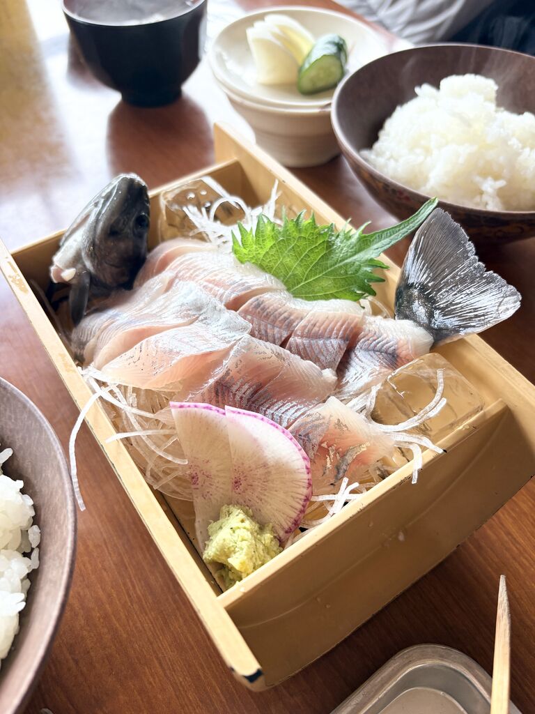 今年も大好きな船場亭さんの鮎ランチ。子どもの頃から毎年楽しみにしています♪今年は遅くなってしまいましたが、パリッとふわっと焼かれた鮎の塩焼きにコリッと甘い鮎刺最高でした!焼き場を見学したり、川を眺めたり待ち時間も非日常で癒されました^ ^ (訪問:2025/10/18)