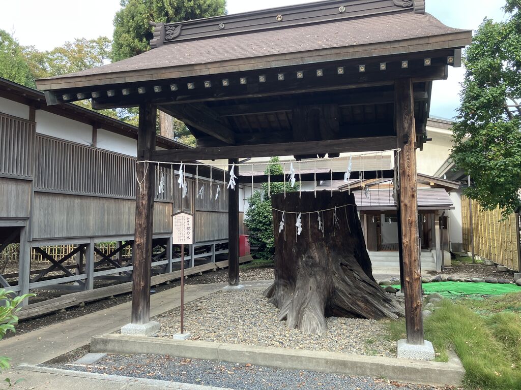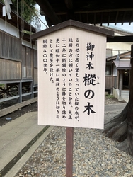 | ◇御神木 | 樅の木は樹齢800年余りで高くそびえ立っていましたが、社殿の方に傾いていたことから、大正12年(1923)に幹を切り詰め、更に昭和11年(1936)に今の高さに切り落として覆屋が設けられました。 |