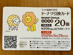 ミスドの福袋に入ってた税込209円以下のドーナツ20個分引換え券を使い4つのドーナツとそれとは別に引換券を使わずに気になったあんバタードーナツを購入!あんバタードーナツは、黄色味のある生地がしっとりして美味しかったです♪ (訪問:2026/01/20)