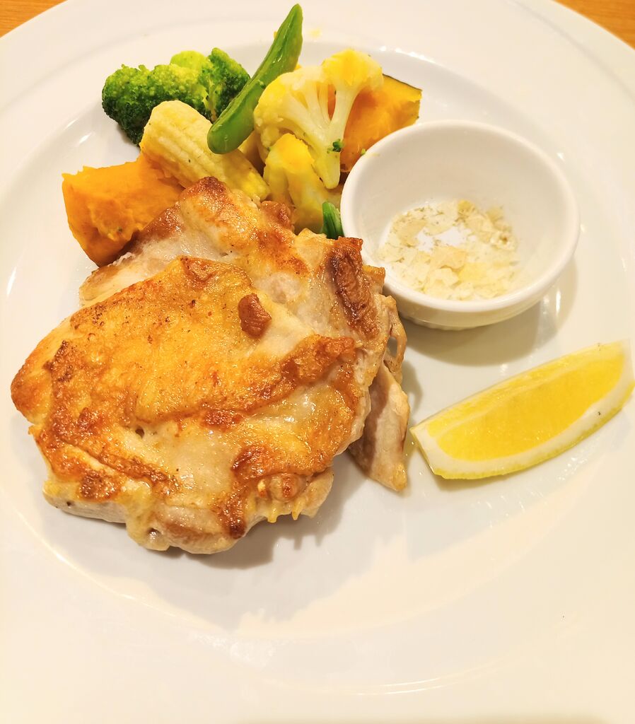 「チキンステーキ」(759円)を注文しました。外側はカリッと焼かれていて、中は柔らかくてジューシーです。温野菜が添えられていて栄養バランスがよさそうなのも嬉しいです。ローズマリーソルトとレモンをかけていただきました。「カリカリポテト」(495円)も美味しかったです。 (訪問:2025/08/02)