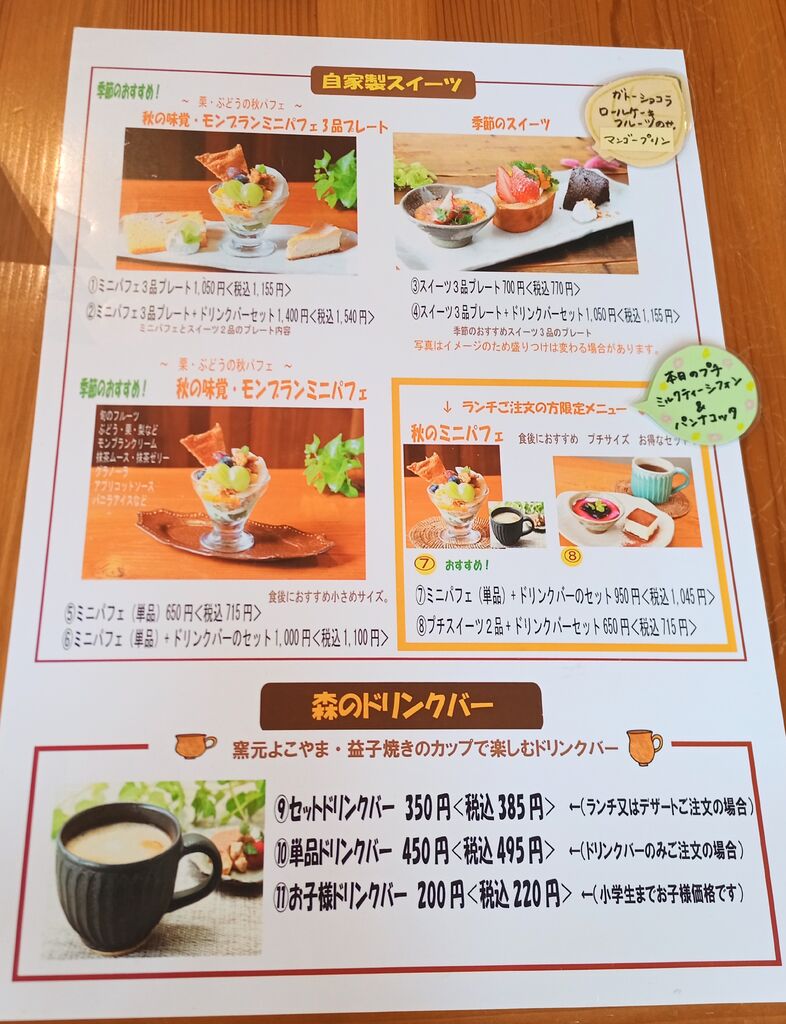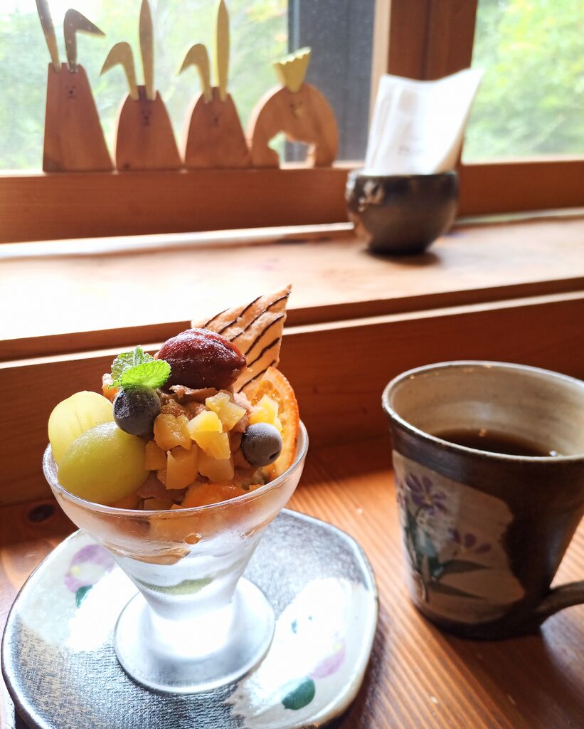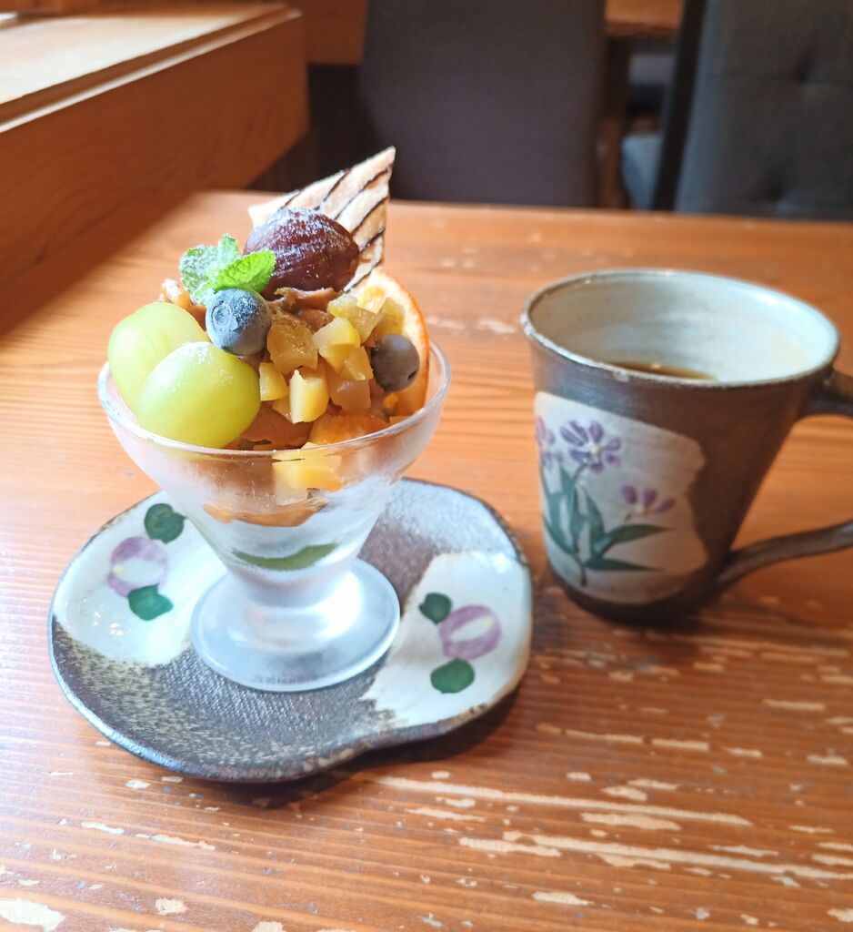「季節のミニパフェ」とドリンクバーのセットを注文しました。ぶどうやモンブラン等、秋の味覚をあしらったパフェです。食べ進めていくと抹茶ムースと抹茶ゼリーも入っていました。地下のお席に案内していただき、窓際にうさぎの木彫りが飾られていて可愛かったです。 (訪問:2025/09/13)
