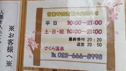 さくら温泉さんに初めて行ってみました。土曜日の夕方6時頃の入浴でしたが、その日は混雑していました。女湯は洗い場が4つしかないので、混雑していしている時は待ちます。シャンプー、リンス、ボディーソープは備えつけがあり、手拭いは販売もされていて、手ぶらでも大丈夫そうです。お風呂は熱めで、とても良いお湯でした。とても寒い日だったので温まりました。脱衣所はそんなに広くはないので、家族も一緒なら次回は個室風呂を利用してみたいと思いました。PayPayも使えて便利です。入り口付近ではお米や野菜などの農産物の販売もしていましたよ。 (訪問:2026/01/25)