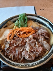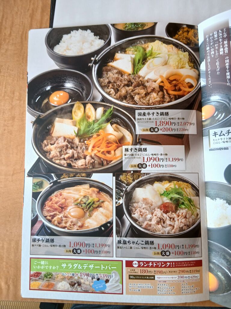 先月、食べに来てとてもうまく、そして、割引券をもらっていたので、ふたたび食べに来ました。今回は、キムチ牛すき鍋膳と濃厚抹茶とバニラ白玉アイスを、食べて来ました。鍋膳は、肉大盛にしました。肉は、やわらかくて、甘じょっぱく、そこへキムチが入り酸味と辛みが加わり、とてもうまく、ごはんのおかわりを大盛りにして、注文するとロボットが持って来てくれました。そして、デザートは、白玉がモチモチで濃厚な抹茶と食べると、抹茶の香りが鼻から抜け、冷たさもあり、とてもうまかったです。また、支払い後に、割引券を頂いたので、また、食べに来ようって思っています。ごちそうさまでした。 (訪問:2025/09/29)