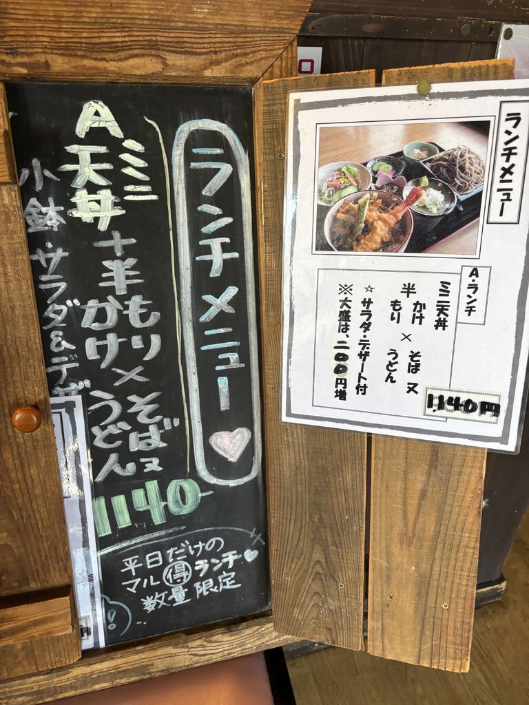 久しぶりにランチを頂きに訪問しました♪もちろんAランチで、ミニ天丼、サラダ、デザートが付いてそばかうどんを選択します。冷たいそばで大盛りにして注文しました!そばはコシガありとっても美味しいです♪天丼もエビ、かき揚げ、春菊に濃いめのタレで食が進みます!お腹が空いていたので、蕎麦を大盛りにしました♪大満足のランチになりました(^^) (訪問:2026/03/09)
