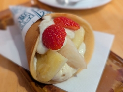 | ◇パフェとて 塩原名物「とて焼」。フルーツたっぷり「くだものやパフェ」をくるりとクレープ風に巻いてあります。飲み物とセットあり。テイクアウトで食べ歩きもgood♪ |