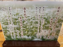 まだまだ、暑い日が有りますね。冷たい蕎麦の昼ご飯も終盤戦。今日は惜しみつつ、天もりを注文。ここの蕎麦は何気に旨いです。角の立った、香りの強い地元の蕎麦。精進揚げも旨いです。テーブルには地元の俳句の名人、鈴木千夜女(ちやめ)さんの俳句。ほのぼの^_^ (訪問:2025/09/30)