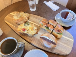 少し遅いお昼ごぱんをいただきに伺いました。年明けの営業とのことで、コーヒーとカイロのサービスをいただいちゃいました。ありがとうございます~。モーニングプレートの時間は終わっていたので、ショーケースの中から「ローストチキンとキャロットラペ」「グラタンパン(グリーンカレー風味)」「玉ねぎときのこのガーリックフォカッチャ」「あんクリームチーズ」を購入。コーヒーと一緒に、イートインさせていただきました。おしゃれに並べられたプレートが登場すると、思わず「おぉっ」と歓声がこぼれます。ちょうど良い感じにリベイクして提供してくれるので、おうちでいただくより何倍も美味しく感じました。また2026年も、たくさん美味しいパンをいただきに伺いたいと思います。美味しい幸せをありがとうございました。ごちそうさまでした~。 (訪問:2026/01/03)