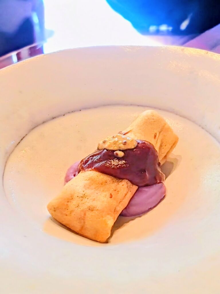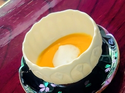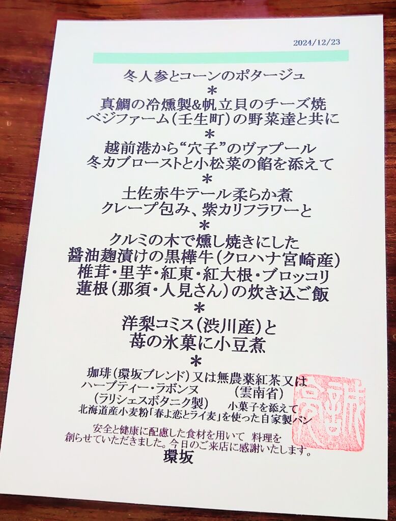 今年の誕生日も環坂さんで食事を楽しみました。。。満席率が高い場所なので早い時期に予約をして伺いました( ◜‿◝ )♡。。。ここは気取らずにお箸で食べられる創作フレンチのお店ですが、生産者の方や産地に拘った食材から作り出されるシェフの料理は、意外とシンプルな味付けで食材の持つ味わいを最大限に引き出していて箸が止まらない旨さです(✿^‿^)。。。本日の料理は…人参の香りと味わいを存分に楽しめる熱々のポタージュに始まり〜鯛とホタテが乗るサラダ〜新食感♪超柔らかァでトロットロ・ホッコリの食感のヴァプール(蒸)した穴子!カブと小松菜の濃厚なソースが絡み何とも言えない幸せな味わい〜赤ワインだけで煮込んだ土佐赤牛のテールはビーフシチューを彷彿させる深い味わいでマスタードの辛味が味を引き締めています〜春よ恋とライ麦の自家製パンは芳ばしくて美味しい〜醤油麹漬けしクルミの木で燻し焼きにしたビーフは柔らかく噛むと肉汁と共に旨味が口の中に広がります〜共に供される蓮根の炊き込みご飯は半分ほど頂き、、残りはお茶漬けかカレーでは頂きます〜デザートも頂き大満足のランチでした(*´ω`*)。。。特に特別な日にユックリと美味しい食事を楽しみたいお店【環坂】さん!お勧めのお店です( ^-^)ノ∠※。.:*:・'°☆ (訪問:2024/12/23)