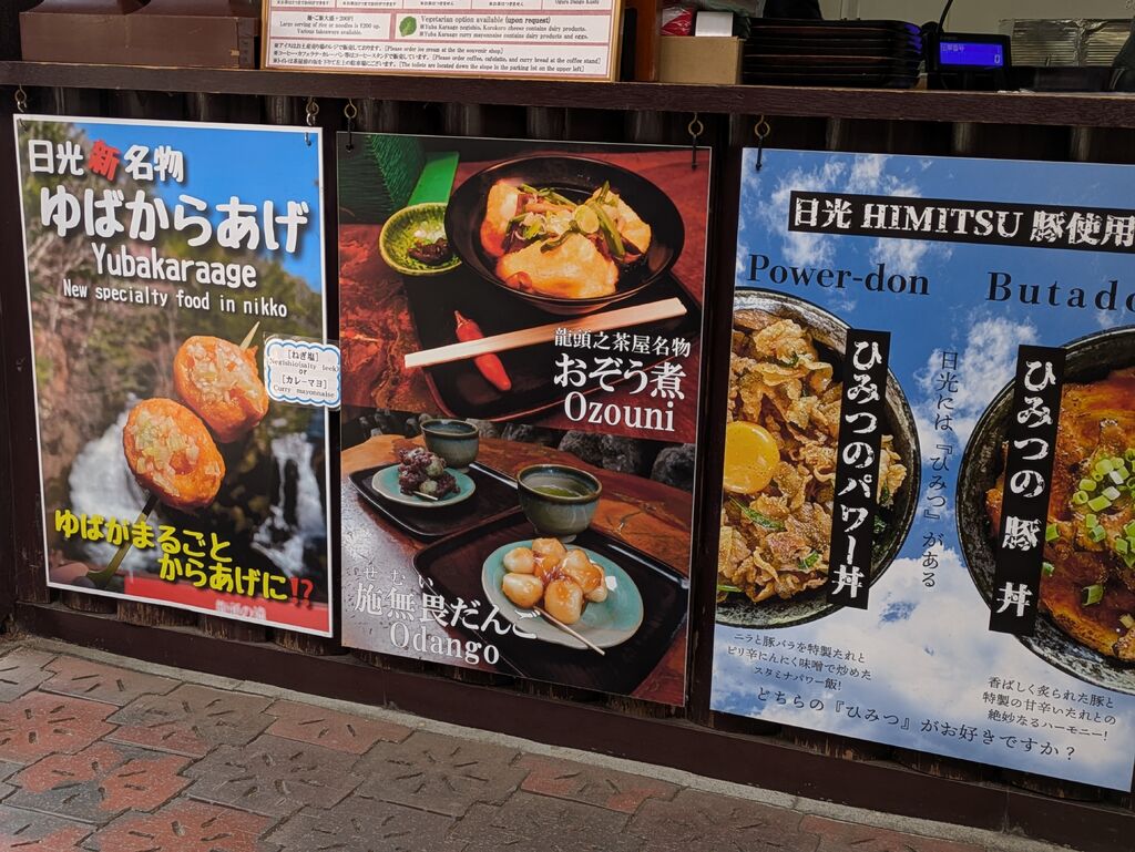 龍頭の滝を眺めながらお食事を楽しめます。オススメは茶屋名物のお団子とおぞう煮です。またひみつの豚丼・ひみつのパワー丼も人気です。併設のカフェではカフェラテや日光埋蔵金ホットショコラが人気です。