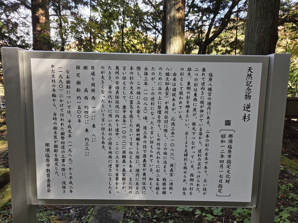 初めて立ち寄りました。逆杉を見て、すごい迫力と生命力、なんとなく、古代からの由緒の有る、歴史の中に居る様で、とても感動いたしました。また、池の水は素晴らしく澄んでおり、真っ白な大きな鯉が泳いでいました。 (訪問:2025/11/03)