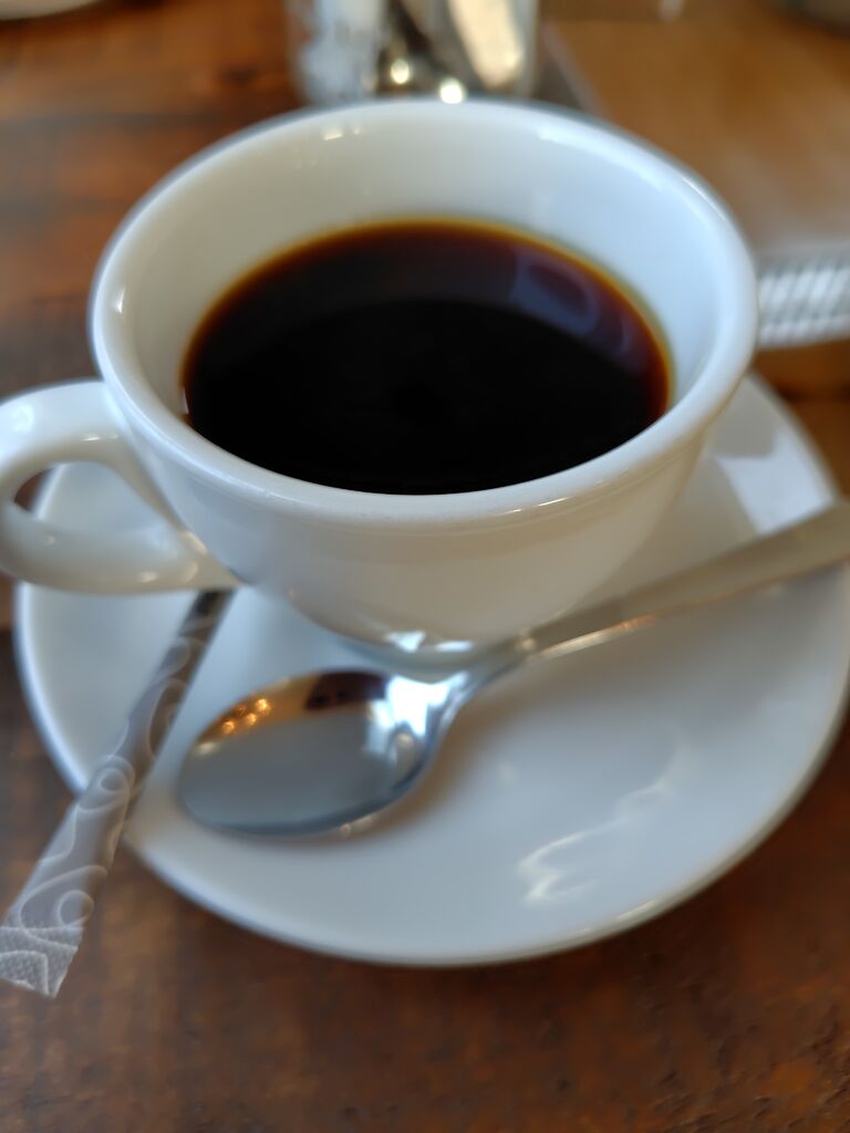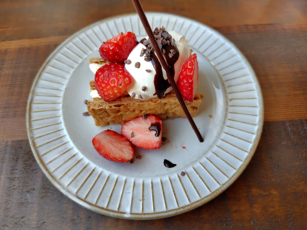 友人とお茶をしました。こちらは高校生以下は入店できないためお子さんが一緒のときは来られないからと友人はチョコレートパフェを注文しました。ブラウニーやアイス、チョコのプリンなどがぎっしりのっているパフェです。私は【ミルフィーユ(580円税込)】【ビターブレンド(550円税込)】にしました。ミルフィーユが最初から横になっていて食べやすいです。パイがサックサクで苺がたくさんのっていて美味しいです。山姥切国広展のチケットを持っている方のみが注文できる国広verのパフェもあり、写真でも迫力のあるパフェだと分かります。山姥切国広展に来た方々に楽しんでもらいたいという店主さんの気持ちの表れだと思います。 (訪問:2025/02/15)